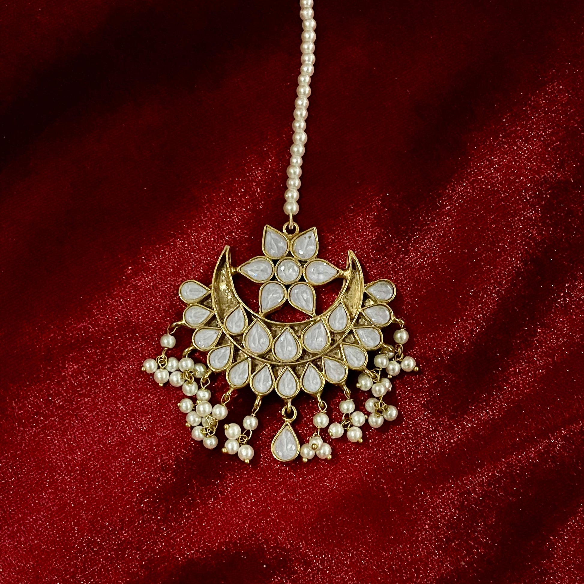 Channel timeless elegance with the Zareen Tikka, a dazzling piece inspired by the crescent moon and floral motifs. Adorned with lustrous faux pearls and glimmering stonework, this gold-plated accessory is a perfect blend of traditional artistry and modern charm. The intricate craftsmanship and delicate dangling beads add a regal touch to your look, making it ideal for weddings, festive celebrations, or special occasions.